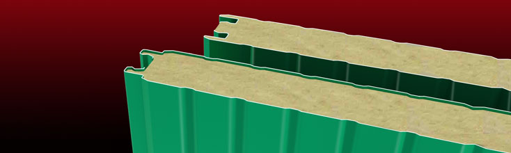Pannelli metallici precoibentati con isolamento in fibra minerale per pareti (disponibili anche nella versione con supporto interno forato).