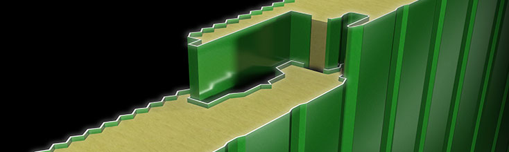 Pannelli metallici precoibentati con isolamento in fibra minerale per pareti a giunto nascosto(disponibili anche nella versione con supporto interno forato).